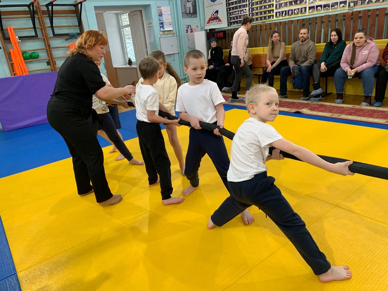 Ребята состязались в 5 испытаниях: эстафета, командный прыжок в длину, демонстрация укэми (самостраховок), борьба за поясок и перетягивание каната